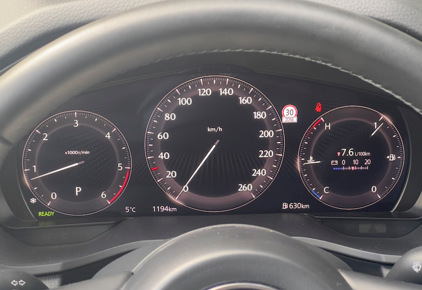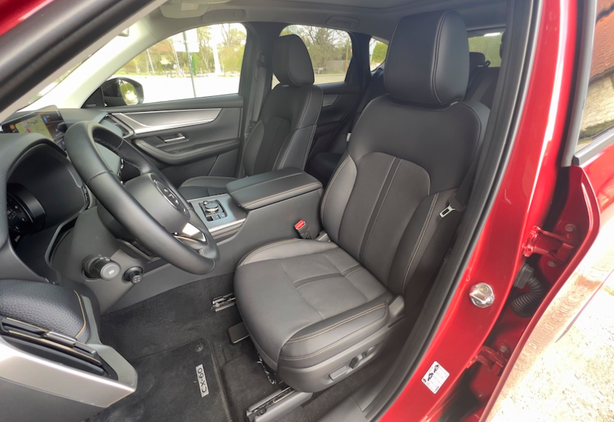 Bemerkenswert auch: vor allem die unsaubere Fahrwerksabstimmung, die uns beim Plug-in-Hybrid in der Ausgabe 12-01/23 gestört hat, gehört wohl auch der Vergangenheit an. Nicht dass der CX-60 jetzt weichgewaschen ist. Seine Federung arbeitet nun aber nicht mehr stoßig-hart, zeigt bei Unebenheiten ein Herz und dämpft nobel und vornehm. Dazu kommt die Tatsache, dass sich der Wagen dank fehlenden Allradantriebs auch agiler anfühlt. 165 Kilo weniger Gewicht und eine gefühlsechtere Lenkung lassen deutlich mehr Fahrfreude aufkommen, womit wir beim dritten Kapitel wären – den Kosten.