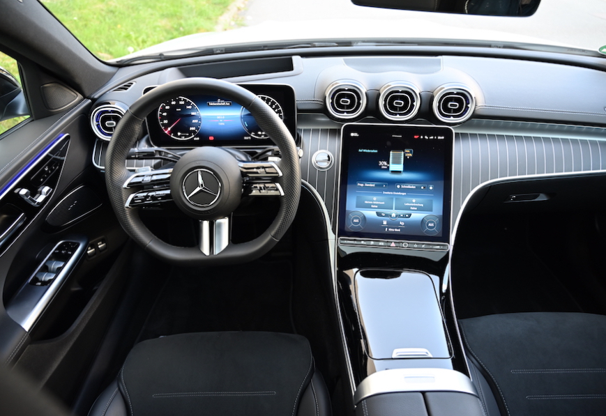 Der Test belegt die Vermutung, dass der Alltag in der feinen C-Klasse-Limousine mit Allrad und AMG-Line-Ausstattung locker ohne Abstecher an die Fossilien-Ladestelle über die Runden kommt. 100 Kilometer rein elektrisch sind nämlich durchaus zu schaffen und wer will, findet selbst auf der Mittel- und Langstrecke so viele Schnelllader, dass man sich das Gebrumm der alten Welt nicht allzu oft anhören muss. Man könnte es als Nachteil der Stecker-Hybridisierung anführen, dass man die Nachteile des Verbrenners – die Anfahr-Gedenksekunde, das Geräusch, welches die Drehzahlveränderung des Hubkolbenaggregats begleitet (von „Aufheulen“ zu reden, schiene mir im vorliegenden Fall zu viel) – umso stärker wahrnimmt, je seltener sie auftreten. Desgleichen tritt in der üppig ausgestatteten C-Klasse ein anderer Aspekt in den Vordergrund, der in den vielen Zeilen, die zur Antriebsfrage durchgekaut werden, gern vergessen wird.