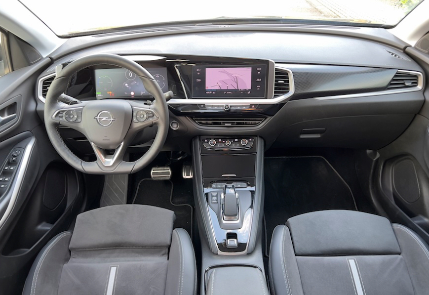 Im Gegenzug zum optisch noch cooleren Alfa Romeo Tonale mit dem Einstiegsmildhybrid und 130 PS steht der Grandland auch in Sachen Antrieb der Optik um nichts nach. Unser Testauto war quasi die Vollfettstufe mit dem Plug-in-Hybridantrieb und einer Systemleistung von strammen 300 PS. Dafür verantwortlich zeigen neben dem 1,6-Liter-Benziner mit 180 PS vor allem die zwei an Vorder- und Hinterachse angebrachten Elektromotoren mit 81 bzw. 83 kW, die zugleich auch für den elektrischen Allradantrieb sorgen. So ausstaffiert dauert der Sprint auf 100 km/h gerade einmal 6,1 Sekunden, vom Start weg sorgt das Drehmoment des E-Antriebs für ordentlich Power. Die rein elektrische Reichweite gibt Opel mit 67 Kilometern an, in der Praxis waren es mit rund 40 nicht ganz so viel. Wer das Potenzial des Antriebs annähernd ausschöpfen will, der tut gut daran, regelmäßig zu laden, was an der Schukosteckdose 8:40 Stunden und an einer entsprechenden Wallbox rund zwei Stunden dauert. Tut man das nicht, steigt der Verbrauch auf 7,5 bis acht Liter, bei reinem Autobahnbetrieb – für den die wenigsten Plug-in-Hybride gedacht sind – kann es dann auch schon mal zweistellig werden.