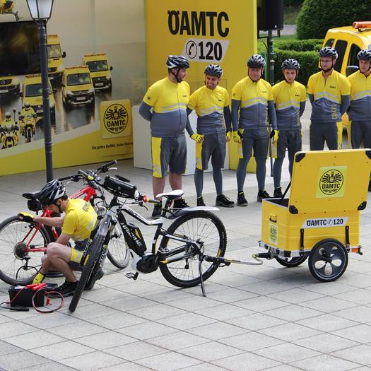 Neue Wege beim ÖAMTC: Pannenhelfer auf E-Bikes samt kleinem Anhänger feiern in Wien Weltpremiere, das Konzept könnte auf weitere Großstädte ausgedehnt werden.