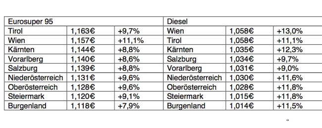 In den vergangenen 100 Tagen stieg der Diesel-Preis in Österreich im Durchschnitt um 11,4% auf 1,032 €, während Eurosuper 95 um 6,1% mehr kostet und somit derzeit 1,135 € zu bezahlen sind, wie der ARBÖ berechnete. Am günstigsten tanken Autofahrer derzeit Burgenland (siehe beigefügtes Foto). Hier kostet Diesel 1,014 € und Eurosuper 95 durchschnittlich 1,118 €. Am teuersten ist Diesel in Wien und Tirol (1,058 €) und Benzin mit 1,163 € in Tirol. Alle aktuellen Treibstoffpreise sind unter www.arboe.at abrufbar.