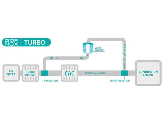 Dafür wird mittels Unterdruck über einen „Bubbler“ die angesaugte Luft mit Wasser angereichert und anschließend mit der Luft des Ladekühlers vermischt. Durch diesen Prozess wird die Verbrennung gekühlt, was die Entstehung von Stickoxiden (NOx) reduziert. Das eingesetzte Wasser nimmt außerdem an der Expansion teil, wodurch Kraftstoffverbrauch und die CO2-Emission reduziert werden sollen. DropNOx greift laut Maasen nicht in die Motorsteuerung ein und ist wartungsfrei: „Lediglich destilliertes Wasser muss nachgefüllt werden, wobei der Verbrauch bei rund 4% des Spritverbrauchs liegt.“