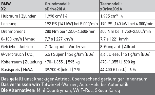 Mit einer Länge von 4,35 Metern ist er immerhin 13 Zentimeter kürzer als der X1. Schwerer ins Gewicht fällt die sieben Zentimeter niedrigere Dachlinie, die den X2 zwar deutlich sportlicher aussehen lassen, dafür aber Kopffreiheit im Fond kosten. Abgesehen davon geht"s aber überraschend luftig zu, zumindest vier Erwachsene können komfortabel reisen. Der Kofferraum ist mit 470 bis1.355 Litern etwas kleiner als beim X1, aber immer noch ausreichend. Das Cockpit kennt man ebenfalls vom größeren Bruder mit der kleineren Nummer, im X2 wurde es im Detail -Stichwort Ziernähte -noch einmal verfeinert.