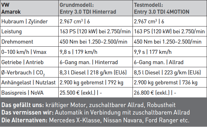 Wirklichüberrascht waren wir von der Power, die selbst der kleine Sechszylinder mit "nur" 163 PS zur Verfügung stellt. Die Beschleunigung von unter zehn Sekunden auf 100 km/h sagt eigentlich schon alles aus, Fahrspaß kommt jedenfalls nicht zu kurz. Selbst auf der Autobahn macht der Pick-up richtig Spaß,9,5 Liter Verbrauch sind noch in Ordnung. Die maximale gebremste Anhängelast von 2,9 Tonnen kann sich sehen lassen, die Zuladung von über 700 Kilogramm ebenso. Womit wir beim Preis und damit der nächsten Überraschung wären. Mit Hinterradantrieb gibt"s den Amarok V6 bereits ab 25.500 Euro netto, Allrad kostet 1.300 Euro netto mehr.