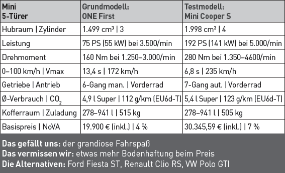 Doch auch Menschen, die weniger für Design, dafür mehr für Fahrdynamik übrig haben, werden beim Cruisen grinsen, besonders wenn das "S" vom Kühlergrill lacht. Beim Testauto heißt das: ein 2-Liter-Vierzylinder- Benziner mit 192 PS und ein 7-Gang-Doppelkupplungsgetriebe unterm Blechkleid. Das Ergebnis: eine Rennsemmel, die Tempo 100 in 6,8 Sekunden erreicht und sich fährt wie ein Gokart. Fahrspaß pur. Bei normaler Fahrweise findet man mit rund 6,3 Litern das Auslangen. Apropos Liter, von denen passen 278, bei umgeklappten Sitzen 941 in den Kofferraum des Fünftürers. Ganz und gar nicht Mini ist der Preis des bayerischen Briten. 30.345 Euro sind für den fünftürigen Cooper S Automatik mindestens fällig. Beim Testauto inklusive Extras standen knapp 50.000 Euro am Preiszettel ...(MOE)