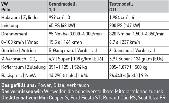 Zurück zum GTI. Der trägt die berühmten drei Buchstaben mit stolzgeschwellter Brust und macht deutlich, dass das kein Marketingschmäh ist. GTI-Zitate wie die rote Linie am Grill oder die hervorragenden Sportsitze mit Karomuster dürfen da nicht fehlen, Herzstück ist aber natürlich der Motor. Statt Downsizing werkt hier ein Zweiliter-Turbobenziner, der seine Kraft mittels eines 6-Gang-Doppelkupplungsgetriebes an die Vorderräder abgibt. Nach 6,7 Sekunden zeigt die Tachonadel Tempo 100, Schluss ist erst bei theoretischen 237 km/h. Wer den Polo GTI einigermaßen normal bewegt, wird mit einem Durchschnittsverbrauch von rund 6,5 Litern belohnt, ein mehr als anständiger Wert für dieses Kraftpaket. Die Bedienung ist VW-typisch perfekt und lässt keine Rätsel offen, ausgerechnet bei der Ergonomie - eigentlich auch eine VW-Domäne - wird gepatzt. Die Höhenverstellung der Mittelarmlehne istoffenbar dem Rotstift zum Opfer gefallen, ein Eigentor. (STS)
