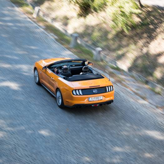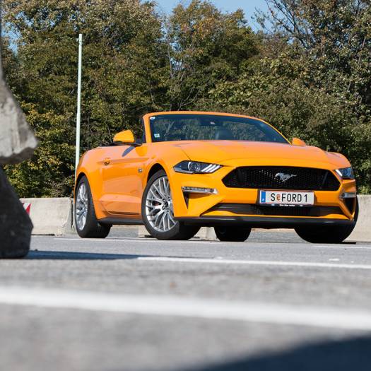Alleine die Daten lassen den Mitteleuropäer gleichzeitig freudig Grinsen und fragend den Kopf schütteln: V8, Big Block, 5.0 Liter Hubraum, 450 PS. Das sieht, spürt und hört man hierzulande eher selten, deshalb sei die Frage erlaubt: „Muss denn das wirklich sein?" Nein, muss es nicht. Aber es macht unglaublich viel Spaß! Und der beginnt bereits beim Drücken des Startknopfs, wenn die acht Kolben den Takt vorgeben und die Maschine zu blubbern beginnt - und bei jedem noch so sanften Berührens des Gaspedals laut aufheult. Spätenstens beim 4,3-Sekunden-Sprint auf Tempo 100 weiß man, es ist nicht nur Schall und Schein unter der Haube des Amerikaners, die Leistung wird auch auf den Asphalt gebracht, zumindest bei eingeschalteter Traktionskontrolle. Und das sehr brutal und kompromisslos. Durch das neue Dämpfersystem „MagneRide" liegt das Wildpferd nun besser auf der Straße, durch seine zehn (!) Gänge schaltet die ebenfalls überarbeitete Automatik unaufgeregt aber flott. Der Durst ist groß, 15,3 Liter dürfen es bei artgerechter Fahrweise sein - es geht aber auch deutlich drunter. Ein astreiner Sportwagen will der Mustang weiterhin nur bedingt sein, immerhin bringt er fast 1,8 Tonnen auf die Waage und ist alles andere als „kompakt". Er ist und bleibt ein Gran Turismo. Und lädt gerade als Cabrio zum Cruisen ein. Apropos Cabrio, das Verdeck öffnet sich zügig und ruhig - typisch amerikanisch müssen aber zwei Abedeckungen händisch angeklippst werden. Im Kofferraum gibt es mit 332 Litern sogar noch Platz für zwei Koffer - es muss also nicht beim kurzen Wochenendausflug bleiben.