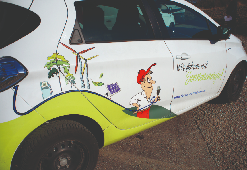 Unter den Pkw findet sich auch ein Renault Zoe. Dieser kam "per Inserat" in die Firma: In einer Tageszeitung entdeckte das Ehepaar Fischer - Gattin Elfi kümmert sich um den Bürobetrieb - ein Inserat, in dem Elektroautos als Firmenfahrzeug angepriesen wurden. "Durch Vorsteuerabzugsfähigkeit und Förderung haben wir uns etwa ein Drittel der Anschaffungskosten erspart", freut sich Elfi Fischer und fügt hinzu: "Unser Hallendach ist mit einer Fotovoltaikanlage gedeckt, wir produzieren unseren Strom selber. Ein weiterer Anlass, uns ein Elektroauto zuzulegen."