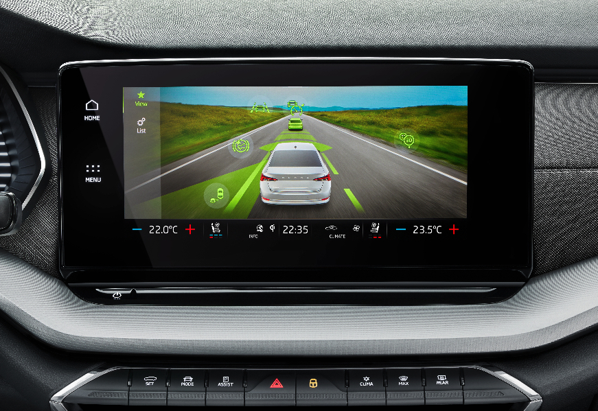 Auch in Puncto Fahrassistenten hat sich viel getan: Erstmals kommen in einem Skoda ein Ausweich-Assistent, Abbiege-Assistent, Ausstiegswarner und die lokale Gefahrenwarnung zum Einsatz. Neu sind auch das Area-View-System, der Seiten-Assistent und der vorausschauende Adaptive Abstandsassistent (ACC), der zusammen mit einer verbesserten Verkehrszeichenerkennung, einem optimierten Spurhalte-Assistenten, sowie dem Stau-Assistenten und dem City-Notbrems-Assistenten den umfassenden Travel-Assistenten bildet. Und sollte es dennoch mal krachen, schützen bis zu neun Airbags, darunter ein Fahrer-Knieairbag und hintere Seitenairbags, die Passagiere.