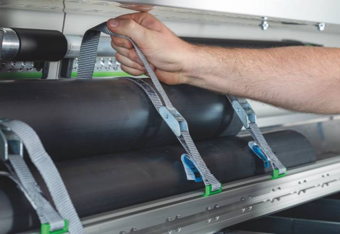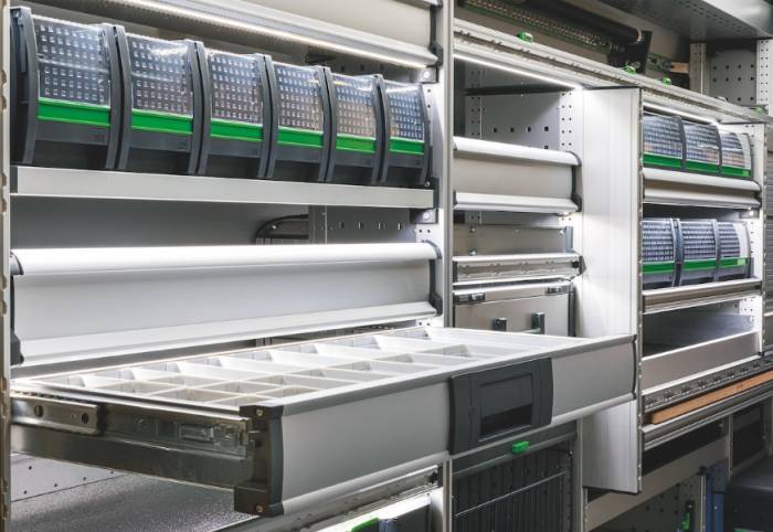 Bei den einsetzbaren Elementen sticht vor allem das neue, voll kompatible "Systainer3"-Koffersystem hervor, das gemeinsam mit Festool und Tanos entwickelt wurde. Das Ergebnis: Sämtliche Maschinen, Werkzeuge und Verbrauchsmaterial sind über passende Koffer perfekt in die vario3-Fahrzeugeinrichtung integrierbar und so stets schnell griffbereit und sicher verstaut. Ergänzt wird die neue Fahrzeugeinrichtung durch Innovationen wie die neue varioSlide-Schublade. Die Schublade aus Aluminium und Kunststoff lässt sich am ergonomischen Griff ganz aus der Fahrzeugeinrichtung herausziehen und mitnehmen. Trennwände und eine Antirutschmatte sorgen dafür, dass der Inhalt während der Fahrt nicht verrutscht. Die neue V-Box am Regalseitenteil bietet eine praktische Möglichkeit, beispielsweise den Zollstock und Kleinteile unterzubringen. So ist das Wichtigste immer schnell zur Hand. Ebenso selbstverständlich: Auch die vario3-Fahrzeugeinrichtung ist universell konfigurierbar und bietet eine große Vielfalt an Möglichkeiten für die Ladungssicherung. Besonders praktisch ist das neue patentierte C-Lash-System, mit dem sich Zurrgurte an Regalen und Ablagewannen an integrierten Nuten (sowohl vertikal als auch horizontal) integrieren lassen. Die Bedienung erfolgt einfach und schnell mit nur einer Hand.
