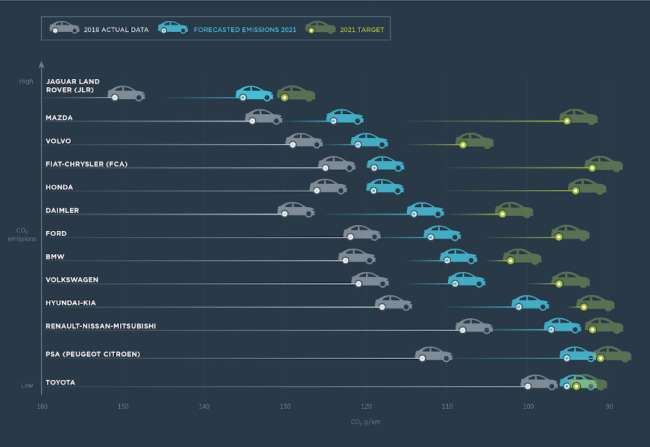 PA Consulting bewertet jeden Hersteller anhand seiner CO2-Prognose für das Jahr 2021. Dabei kommt Toyota mit 18 Millionen Euro Strafe laut den Berechnungen noch vergleichsweise günstig weg. Deutlich härter trifft es neben VW etwa PSA (938 Millionen), Hyundai-Kia (797 Millionen), BMW (754 Millionen), Ford (1,46 Milliarden), Fiat-Chrysler (2,46 Milliarden), Jaguar Land Rover (93 Millionen), Mercedes-Benz (997 Millionen), Renault-Nissan-Mitsubishi (1,06 Milliarden) oder Mazda (877 Millionen).