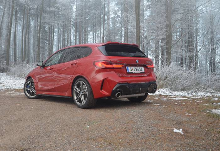 Auch wenn man sich als BMW-Afficionado schon daran gewöhnen muss, dass es beim beherzten Wegspurten erst etwas an der Vorderachse schabt, bevor die Hinterräder vom serienmäßigen Allradantrieb zum feisten Mithelfen überredet werden. Danach aber ist das Feuerwehr-Rot unseres Testwagens weit mehr als ein leeres Versprechen. Das knochentrockene Fahrwerk lässt gemeinsam mit der mechanischen Torsen-Sperre an der Vorderachse zudem auch in Kurven nix anbrennen. Der Kurven-Grip ist enorm. Der zur BMW-Kultur gehörende Heckschwänzler am Kurvenausgang fällt aber flach.
