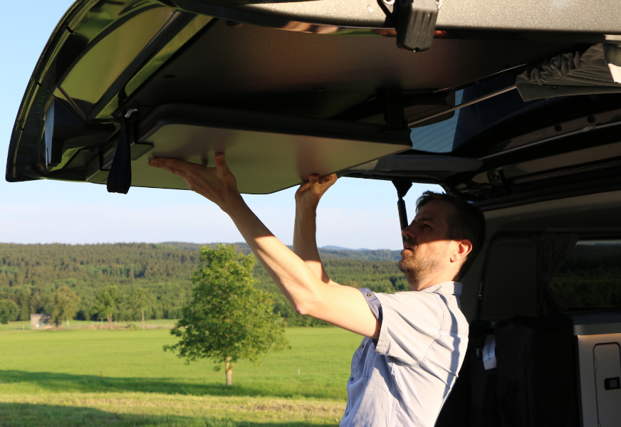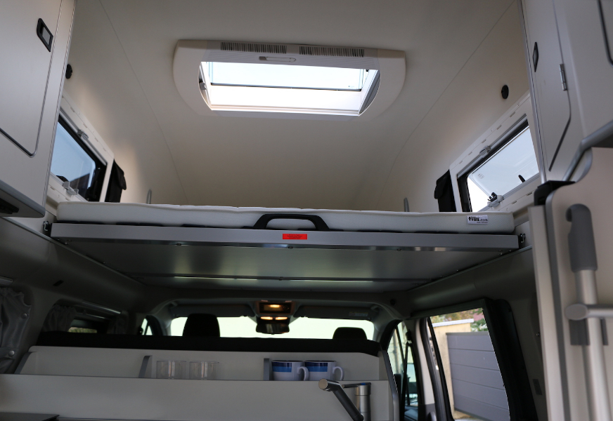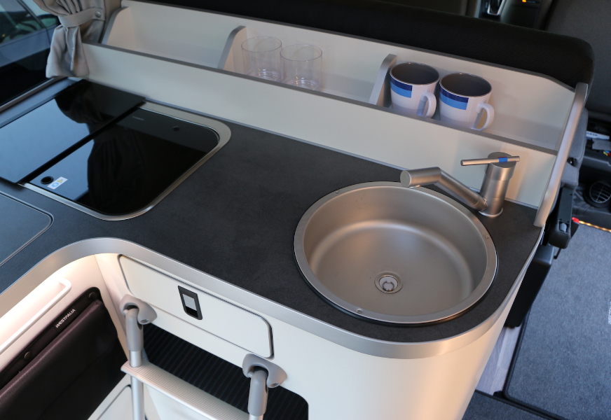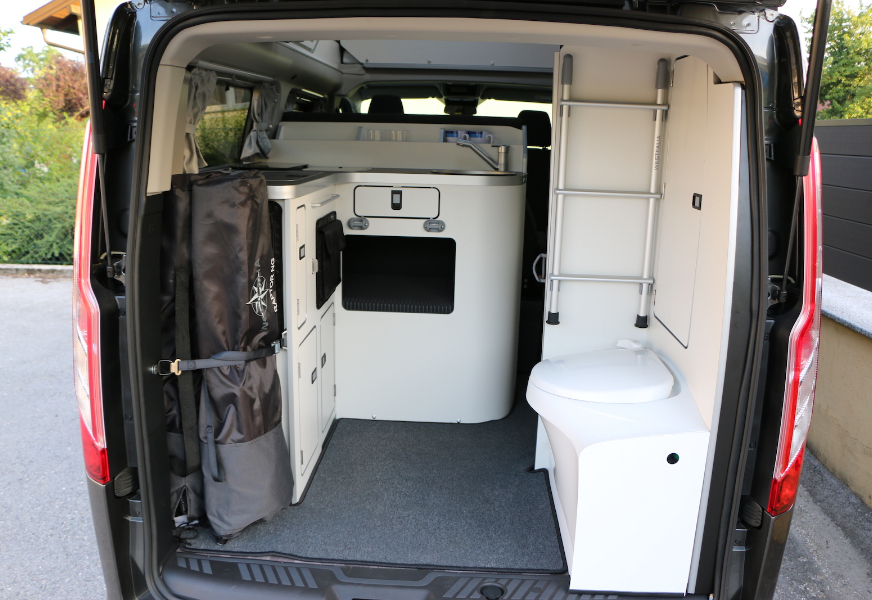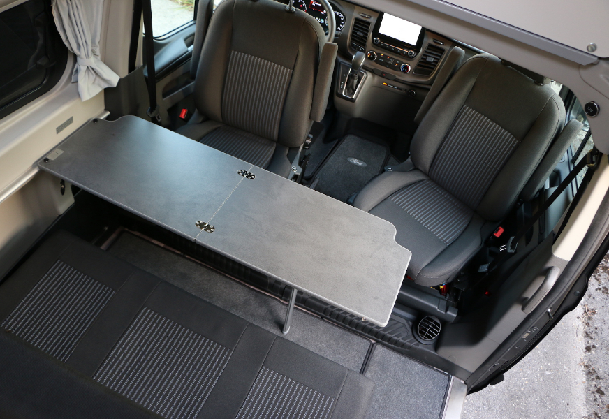 Und wie sieht es dahinter aus? Nun, die „gute Stube“ erfreut mit durchaus großzügigen Platzverhältnissen, das Hochdach und der lange Radstand tragen maßgeblich dazu bei. Ob die – nicht räumlich abgetrennte – Toilette Sinn hat oder hier zusätzlicher Stauraum praktisch gewesen wäre, muss jeder für sich beantworten. Wobei es an Stauraum grundsätzlich nicht mangelt, Bekleidung für vier Erwachsene stellt jedenfalls kein Problem dar. Zu gefallen weiß auch die schicke Eckküche im hinteren Bereich das Transit Nugget Plus, die auch ein Gaskochfeld mit zwei Kochstellen und einen Kühlschrank beinhaltet. Mit wenigen Handgriffen lässt sich quasi als Zwischendecke das Schlafgemach im ersten Stock einziehen, jede Menge Platz für zwei Erwachsene, auch groß gewachsene. Unten ist der Umbau von der Sitzgruppe zum Bett etwas umständlicher, ein Erwachsener oder zwei Kinder finden aber auch dort ordentlich Platz. Wer das Auto nicht nur beim Campen, sondern auch im Alltag nutzen will, sollte dennoch zum kürzeren Nugget mit Aufstelldach greifen.