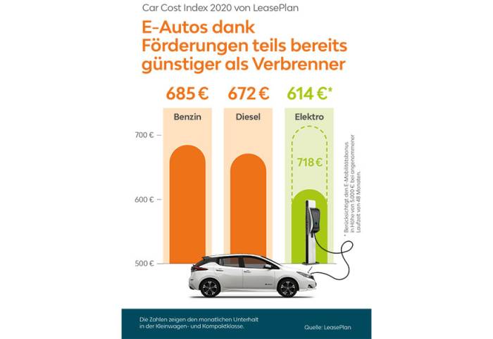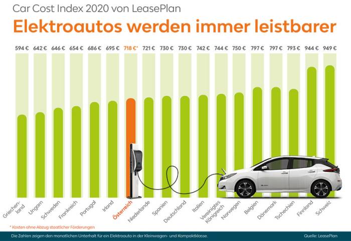 Im Rahmen des jährlich von des von LeasePlan veröffentlichten „Car Cost Index“, der die monatlichen Mobilitätskosten für Fahrzeuge aller Klassen in 18 europäischen Ländern aufschlüsselt, zeigte sich, dass mittelgroße Elektrofahrzeuge in den meisten untersuchten Ländern kostenmäßig bereits konkurrenzfähig mit klassischen Verbrennern sind, so auch in Österreich. Der Car Cost Index von LeasePlan beinhaltet die tatsächlichen monatlichen Unterhaltskosten für Autos in 18 europäischen Ländern, einschließlich Treibstoff, Wertverlust, Steuern, Versicherung und Instandhaltung.