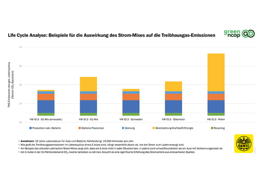 Max Lang, Fahrzeug- und Umweltexperte beim ÖAMTC: "Bisher haben wir die Fahrzeuge im Fahrbetrieb untersucht. Das ändert sich ab sofort, denn nun wird jedes Auto, das die Green NCAP-Messungen durchläuft, zusätzlich einer Lebenszyklusanalyse unterzogen. Das ist ein wichtiger Schritt, um die tatsächlichen THG-Emissionen darzustellen, indem beispielsweise auch die Erzeugung der Batterie beim E-Auto und die Bereitstellung von Kraftstoff bzw. Energie berücksichtigt werden." Ein weiterer wichtiger Aspekt: Es wurde der Gesamtüberblick der insgesamt 61 Testkandidaten untersucht, sprich: sie wurden rückwirkend der Lebenszyklusanalyse (englisch: Life Cycle Assessment, kurz: LCA) unterzogen.