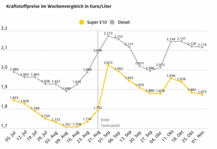 In Zahlen bedeutet das: 2012 hat E10 im Schnitt 1,589 Euro der Liter gekostet, Diesel 1,478 Euro. 2022 gab es hingegen keinen Tag, an dem die Treibstoffe im Schnitt günstiger gewesen wären. Bleiben die Tarife bis Jahresende auf ähnlichem Niveau – wovon leider auszugehen ist – wäre der Liter Eurosuper mit durchschnittlich 1,88 Euro um 29 Cent teurer als der bisherige Rekordwert von vor zehn Jahren – Diesel mit 1,98 Euro sogar um 50 Cent.