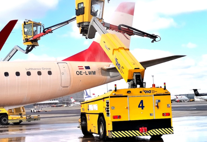 Jobs in der Luftfahrt sind grundsätzlich speziell und mit viel Verantwortung verbunden, das gilt natürlich auch für die Truppe von Niki Fleisz, dem Teamleader Enteisung am Flughafen Wien. Fleisz ist bereits seit 22 Jahren dabei und hat die Entwicklung mitgeprägt. Sein Fahrzeug ist ein SafeAero 220, der von einer Person bedient wird. Das Spezialfahrzeug mit ausfahrbarer Kabine wiegt mit Wasser und Enteisungsflüssigkeiten vollgetankt stolze 25 Tonnen. Ein von einem 163 PS starken Dieselmotor befeuerter hydrostatischer Antrieb reicht dabei für das Vorankommen aus. 7.400 Liter Flüssig- keiten sind in drei Tanks untergebracht und werden dabei je nach Bedarf gemischt und mit elf bar Druck auf dem Flugzeug aufgebracht.