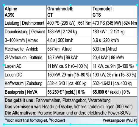 Beim Laden setzt man indes keine Maßstäbe. Zwar wird die 400-Volt-Technologie vor allem mit der Batterie des GTS – die von einem anderen Hersteller kommt als jene des GT – und einer Ladeleistung von 190 kW ausgereizt, der GT bringt es aber lediglich auf 150 kW. In 25 bzw. 29 Minuten ist der Akku von 15 auf 80 Prozent geladen. Die Österreich-Preise sind noch offen, man darf sich aber an Deutschland orientieren, wo man bei netto 56.250 (GT) bzw. 65.000 Euro (GTS) liegt. Exklusivität hat eben auch ihren Preis. •