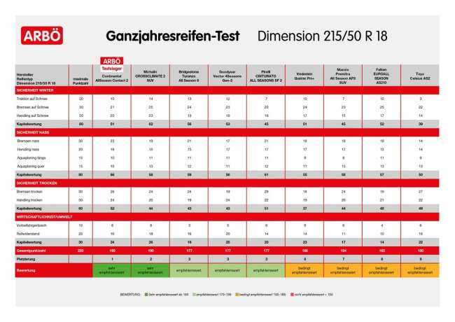 Vor wenigen Jahren galt der Ganzjahresreifen noch als vernachlässigbare Randerscheinung. Der stetig steigende Kostendruck und die immer milder werdenden Winter führten aber zu einem massiven Umdenken. So massiv sogar, dass heutzutage jeder fünfte verkaufte Reifen in Österreich bereits ein All-season-tyre ist. Man spart sich damit schließlich den saisonalen Reifenwechsel, benötigt kein Reifendepot und ist dennoch bei jeder Witterung legal unterwegs. Auf der anderen Seite müssen diese Alleskönner sowohl im Winter auf Schnee als auch im Sommer auf heißem Asphalt guten Grip haben. Ein Kompromiss, der nicht gerade leicht zu stemmen ist. Daher sind ARBÖ und GTÜ der Frage nachgegangen, welcher Pneu diesen Anforderungen am besten standhält. Getestet wurden neun Typen in der Dimension 215/50 R 18, wobei man bewusst Exemplare unterschiedlichster Preiskategorien auswählte.