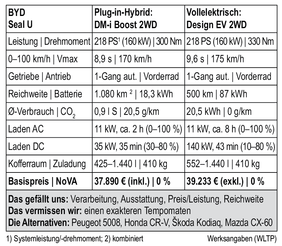 Grundsätzlich spricht vieles für den elektrischen Seal U, dank Vorsteuerabzug gibt es ihn ab netto 36.733 Euro (39.233 Euro netto mit größerem Akku), die Reichweite reicht für viele locker aus. Dennoch ist auch der PHEV interessant. Im Nahbereich ist man elektrisch unterwegs, auf der Langstrecke ohne Einschränkungen, allerdings höherem Verbrauch wie bei einem Diesel. Und auch hier ist der Preis mit 37.890 Euro durchaus heiß, der Aufpreis für Allrad und Turbomotor fällt mit 7.000 Euro hoch aus.