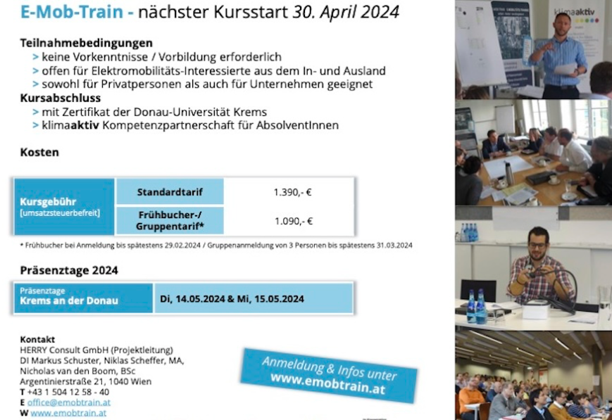 E-Mob-Train ist Österreichs erfolgreichste Aus- und Weiterbildung im Bereich Elektromobilität mit fast 600 Absolventen seit 2016. Die Kombination aus E-Learning und Präsenztagen bietet die Möglichkeit, Wissen im Bereich Elektromobilität effizient und bedarfsgerecht zu vertiefen und sich mit weiteren Teilnehmern inhaltlich auszutauschen und zu vernetzen. Der diesjährige Kurs startet am 30. April 2025 und die Anmeldung ist noch bis 31. März 2025 möglich.