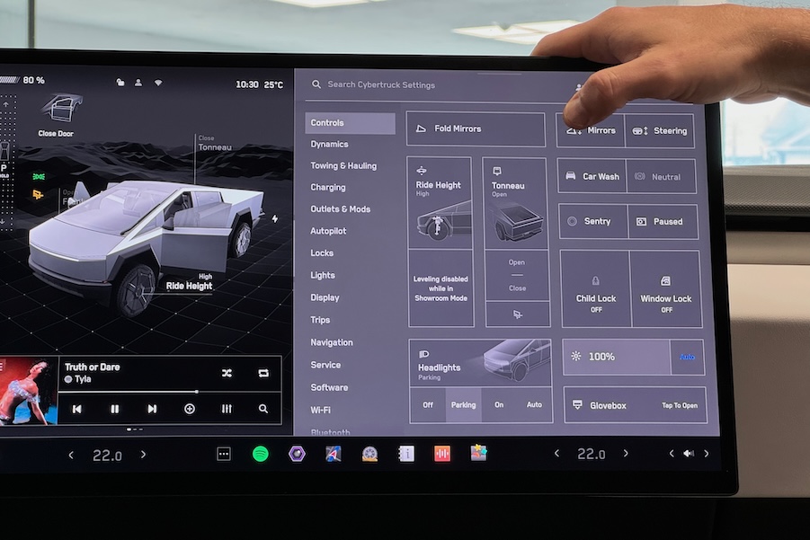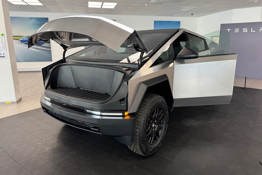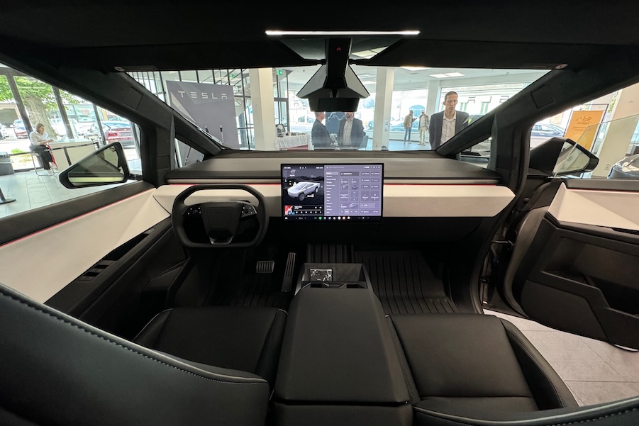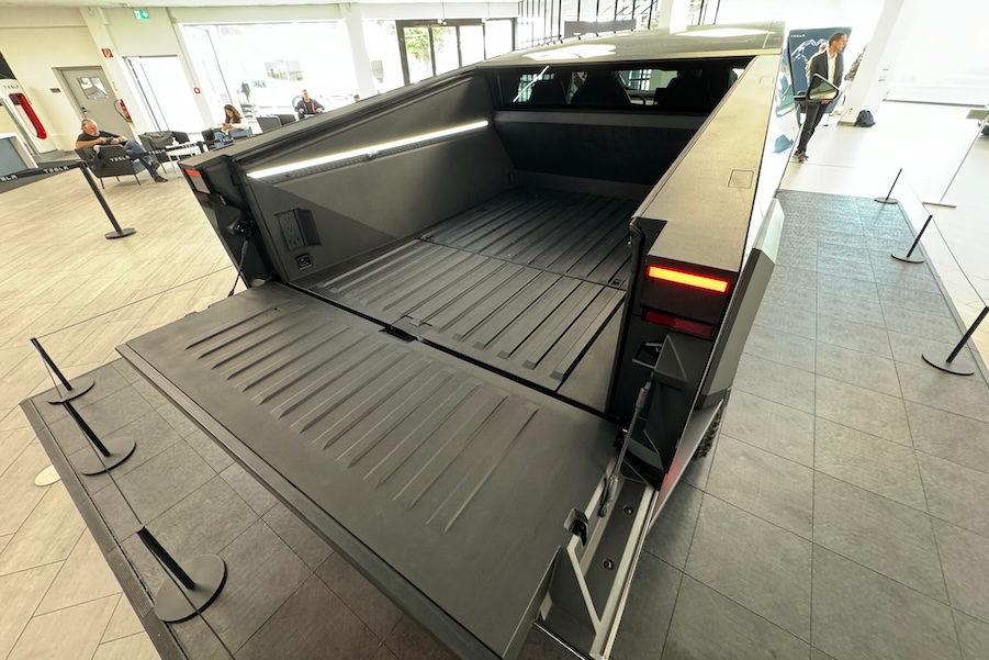 Sehen wir den 5,7 Meter langen Fünftürer also einfach als das, was er im Grunde ist: Ein Pick-up mit Doppelkabine, Platz für fünf und 3.400 Litern Ladevolumen. Das Heckrollo lässt sich per Knopfdruck aufrollen, damit auch etwas sperrigere Gegendstände darauf Platz finden. Innen fehlt jeglicher Cowboy-Flair, der bei jedem Pick-up sonst immer irgendwie mitschwingt. Eher ist alles so, wie man es sich von einem Tesla erwartet. Viel glatte Flächen, kaum Schalter, ein winziges Lenkrad und ein großer Touchscreen, auf dem alles an Funktionen in unendlichen Untermenüs untergebracht wurde. Man kann sich nicht vorstellen, dass hier jemals jemand mit Cowboystiefeln und Jeans-Jacke einsteigen würde und den halben Mist von Montana an den Sohlen auf die Velours-Fußmatten schleppen würde. Ob sich das kleine Volant mit Arbeitshandschuhen überhaut bedienen lassen würde? Die Blinkerknöpfe trifft man jedenfalls nicht, und überhaupt wurde viel von der grundsätzlichen Technik von vielen anderen Teslas übernommen. Es gibt also auch keine Ladebuchsen, kein Hebelwerk oder ähnliches.
