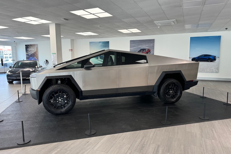 Es hätte auch eine Szene aus TRON sein können. Die muffige 80er-Jahre-Atmosphäre des alten Schauraums eines US-Car-Händlers im Süden von Wien wirkt architektonisch so aus der Zeit gefallen wie der Cybertruck, der genau dort präsentiert wurde – nur von der komplett anderen Richtung. Ähnlich wie im Film aus den Anfängen der Computer-Ära, als man mit riesenhaften Computern in großen Büroräumen mit Spannteppichen am Boden erste animierte Grafiken bastelte, so entrückt schaut – aber das ist real und wir sind im Jahre 2024, und im Rahmen der Odyssey Tour schickt Tesla fünf Exemplare quer durch Europa durch insgesamt gut 100 Städte. Quasi als Gustostückerl aus der Neuen Welt, denn ob und wenn, wann es den Cybertruck jemals in Österreich geben wird, wollte niemand so wirklich sagen.