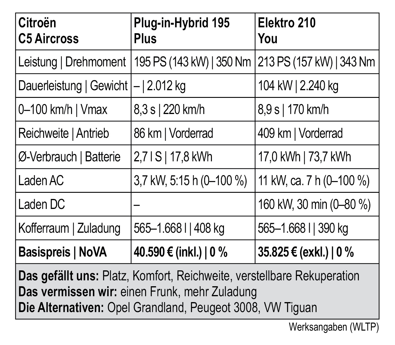 Innen zeigt sich der C5 Aircross aufgeräumt, auf Höhe des Lenkrades läuft innen eine geschäumte Stoffoberfläche bis in den Fond und soll – so Citroën – Wohnzimmeratmosphäre vermitteln. Nicht ganz so hochwertig sind sämtliche Kunststoffe, egal ob am oberen Armaturenbrett, der Mittelkonsole oder der Türvertäfelung, hier regiert Hartplastik. Positiv: Das Platzangebot im Fond ist üppig, je nach Modell gibt es vorne Sitzlüftung, Lehnenbreitenverstellung und Massage und auch der Kofferraum ist mit 565 bis 1.668 Litern ordentlich.