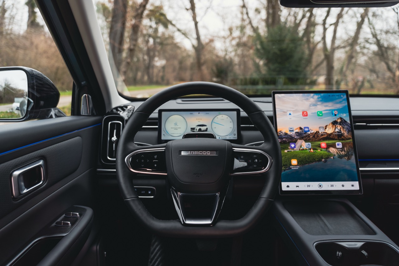 Motorisch wird im Jaecoo 7 PHEV (es gibt auch eine reine Benziner-Variante) ein 1,5-Liter-Vierzylinder mit 143 PS per stufenlosem Getriebe mit einem 150 kW Elektromotor zusammengespannt. Welches Aggregat gerade schiebt oder die Batterie auflädt, entscheidet das Auto. Alle denkbaren Hybrid-Modi sind möglich.