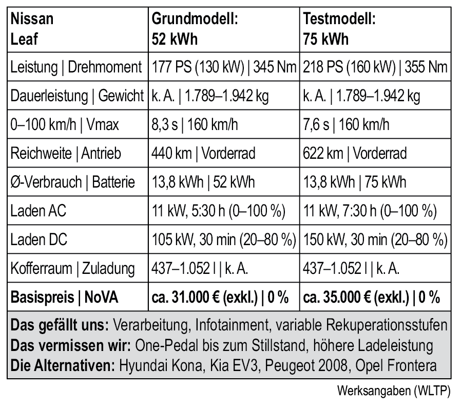 Bei ersten Testkilometern in Dänemark bei nicht allzu hohem Tempo waren die WLTP-Werte von 13,8 kWh auch in der Praxis zu erfahren, ein Praxisverbrauch lässt sich davon aber nur bedingt ableiten. Das Fahrverhalten des Leaf ist jedenfalls harmonisch, besonders gefallen haben die vier Rekuperationsstufen sowie der adaptive Tempomat, schade, dass die One-Pedal-Funktion nicht bis zum Stillstand funktioniert. Preise gibt es offiziell noch keine, in Deutschland werden 31.000 netto für die kleine und 35.000 netto für die große Batterie angepeilt, das sollte auch für Österreich ein Richtwert sein. •