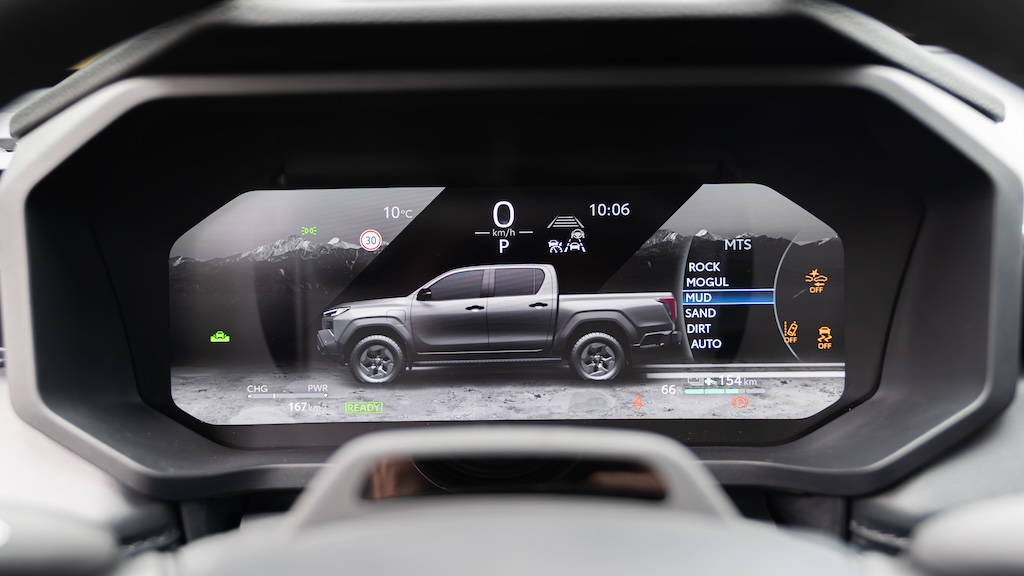 Der Grund dafür ist der Aufbau an sich. Ein E-Motor vorne, ein E-Motor hinten, das erfordert einen ganz anderen Unterbau, in diesem Fall eben mit De Dion-Achse. Die Möglichkeiten indes, die es offroad nun gibt, die wusste man sehr gekonnt für sich zu nutzen. Zahlreiche Fahrprogramme für nahezu alle vorstellbaren Untergründe bewirken ein ganz neues Level an Grip. Zum Umschalten muss auch weder stehengeblieben noch ausgekuppelt werden, dazu hilft das 474 Newtonmeter Drehmoment von der ersten Umdrehung an, gefühlvoller als je zuvor die nächstbeste Steigung zu erklimmen. Man muss tatsächlich zugeben, dass E-Power im Matsch erstaunliche Vorzüge offenbart. Gleichwohl ist man sich bei Toyota bewusst, dass man mit diesem Hilux nicht alle anderen ersetzen wird können. Schon alleine, weil man mit diesem nur 1,5 Tonnen Anhängelast bewegen darf. Und die reduziertere Bodenfreiheit aufgrund der anderen Achskonstruktion wird genauso einigen sauer aufstoßen wie die Reichweite von theoretischen 240 Kilometern. Mehr gibt der 59 kWh große Akku einfach nicht her. Aber – so ehrlich muss man sein – für viele Fälle reicht das locker. Vor allem, wenn der eigene Hof bereits über eine Photovoltaik-Anlage verfügt und man sich eh nur durch den eigenen Forst wühlt.
