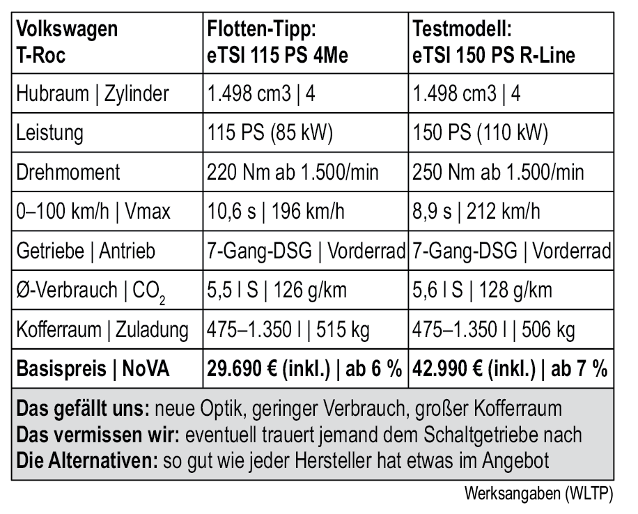 Apropos ID: In der neuen Generation sieht man dem T-Roc die Verwandtschaft zu den E-Autos sehr deutlich an, auch wenn er mit einem E-Antrieb nichts am Hut hat. Vielmehr werkt unter der Haube ein 1.5-Liter-Vierzylinder (Mild-Hybrid), dem die Ingenieure 115 oder 150 PS entlockten.
