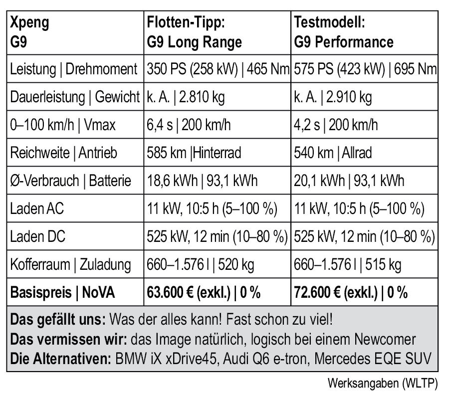 Der Preis des G9 beginnt bei 59.600 Euro (mit 79-kWh-Batterie); mit 93,1 kWh-Akku sind es 63.600 und bei Allradantrieb weitere neun Tausender mehr. Vollausstattung, und zwar so richtig voll, mehr braucht man nicht sagen, bis hin zum Haustiermodus, der die Fenster verriegelt und das Auto klimatisiert.