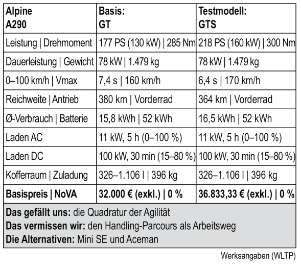 Beide Motorisierungen der A290 schöpfen Saft aus einer 52-kWh-Batterie. Den Verbrauch beeinflusst wie üblich der Stromfuß maßgeblich mit, kalkulieren Sie als des Wagens würdiger Alpine-ist lieber nicht mit dem Katalogwert, eher mit guten
