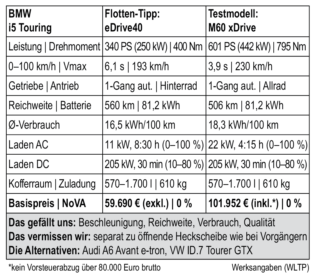 Auch wenn der teils dichte Verkehr in Deutschland keine langen Vollstrometappen erlaubt hat, immer wieder mal zeigte der Tacho über 200 km/h. Beeindruckend, mit welcher Vehemenz es selbst bei 180 km/h nach vorn ging, drückt man das Fahrpedal ganz durch. Die Zwischenladungen gingen nicht minder langsam, auch wenn die Spitzenleistung von 205 kW nur selten erreicht wurde, die 30 Minuten von zehn auf 80 Prozent sind durchaus zu erreichen. Ein Blick in die Preisliste zeigt dann leider auch den Haken an der Sache: Der M60 Touring kostet mindestens 101.952 Euro und ist damit nicht vorsteuerabzugsfähig. Im Gegensatz zum kleineren Modell, das mit netto 59.960 Euro in ganz anderen Sphären unterwegs ist und mit 560 Kilometern sogar mehr Reichweite bietet.