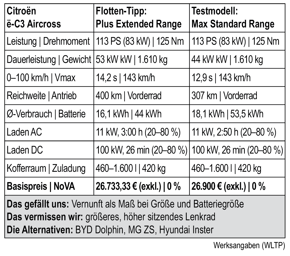 Wem die Ausführungen über all die Tamagotchi-Funktionen zu wenig nach Autotest klingen: Gefahren sind wir natürlich auch. Der Vortrieb ist munter, wenn auch nicht gerade ehrfurchtgebietend: Da werden die Diesel-Kombis schnell wieder frech an der Kreuzung. Sei’s drum, der ë-C3 Aircross ist halt eher kompakter Familiengleiter als quirliger Kurvenräuber. Dafür schafft er brav die versprochenen Verbrauchswerte um die 17 bis 18 kWh, wohl auch aufgrund der sommerlich-optimalen Testbedingungen. Die Reichweite liegt dann bei rund 270 Kilometern. DC-geladen wird mit maximal 100 kW, 20 bis 80 Prozent in rund 30 Minuten. •