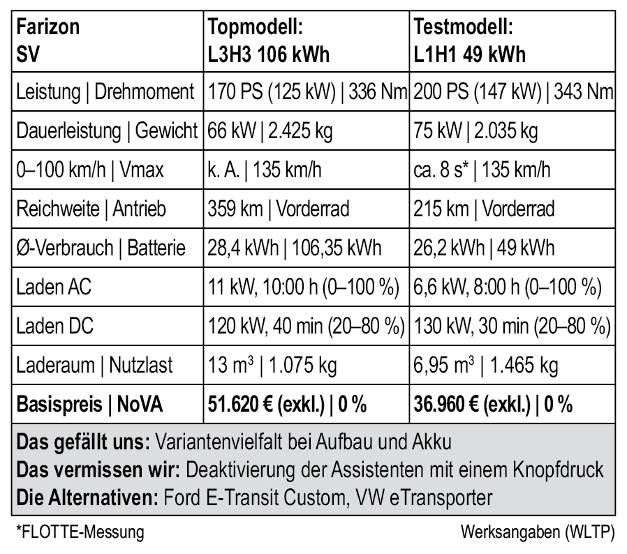 Die Reichweite des Testautos wird laut WLTP mit 215 Kilometer angegeben, ein Wert, der – freilich unbeladen – auch in der Praxis realistisch ist, wie der Testverbrauch von 21,5 kWh gezeigt hat. Beeindruckend ist übrigens auch die Beschleunigung, im Sport-Modus dauert es nur acht (!) Sekunden auf 100 km/h, im Sinne der Reifen wäre Farizon aber gut beraten, hier zu drosseln. Am Fahrverhalten und an der Lenkung gibt es nichts zu kritisieren, spannend, dass es keine mechanischen Verbindungen zwischen Karosserie und Fahrgestell mehr gibt, Drive-by-Wire lautet das Zauberwort. Die Preisliste des SV startet aktuell bei 36.960 Euro netto und reicht bis 51.620 für den L3H3 mit 106 kWh Akku. Top: Fünf Jahre oder 200.000 Kilometer auf das Fahrzeug und acht Jahre oder 200.000 Kilometer auf den Akku sowie fünf Sterne beim NCAP-Crashtest.