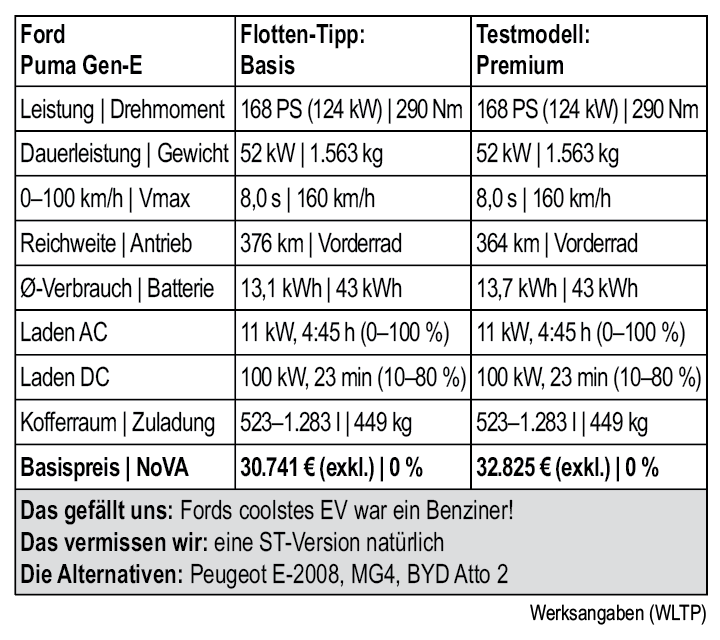Und dann wäre da noch die Optik: Die kühlergrilllose Front steht dem Puma genauso gut wie die neuen Räder und etwas aufgepimpte Scheinwerfer, wobei sich der Innenraum stärker modernisiert zeigt: Die neuen Displays für Cockpit und Infotainment sind angenehm groß, die Software nun wesentlich schneller und beherrscht jetzt auch Apple CarPlay drahtlos, was für einen reibungsloseren Alltag genauso wichtig ist wie zum Beispiel der größere Kofferraum: Die Unterflurbox fasst jetzt nämlich 145 Liter, was auch ein wenig schräg ist – möglich wurde das nämlich erst durch den Entfall des Auspuffs. All das hat natürlich seinen Preis, wobei schnell nachgerechnet: Für mindestens 30.741 Euro netto erhält man eine gelungene Schnittmenge aus Verbrenner- und Elektrotalenten – die genauso einzigartig und Geschmacksache ist wie ein viereckiges Lenkrad, oder?