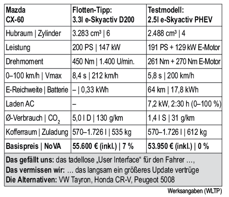 Ein bisschen gegen den Strich gebürstet waren sie bei Mazda ja schon immer, siehe Wankel, siehe Diesotto, siehe Bekenntnis zum Hubraum in Zeiten des Downsizing. Letzteres Credo hält man in Hiroshima auch beim CX-60 wacker aufrecht: Selbst der neu aufgelegte Plug-in-Hybrid verbrennt vergleichsweise großvolumig per 2,5-Liter-Vierzylinder, die sechs Töpfe der Dieselvarianten fassen gar 3,3 Liter.