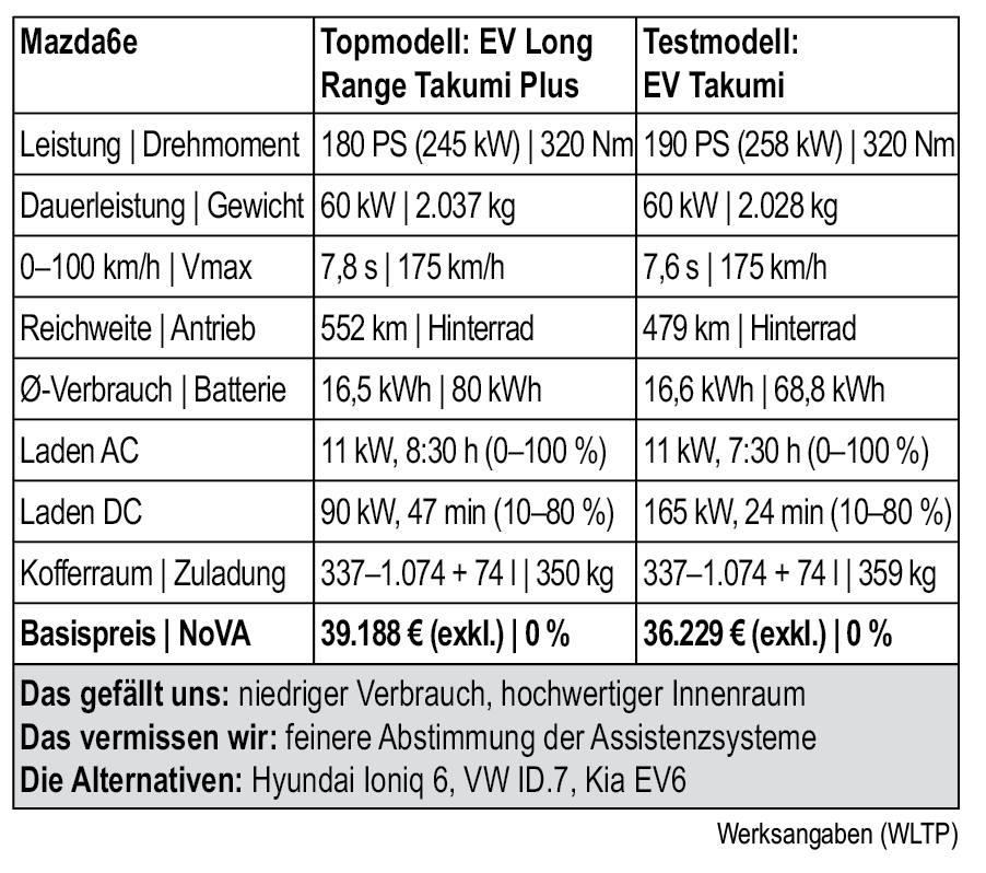 jener im Long-Range (80 kWh Akku) bringt es auf 245 PS, in der Beschleunigung mit 7,6 bzw. 7,8 Sekunden ist da kaum ein Unterschied. Die WLTP-Reichweite liegt bei 479 bzw. 552 Kilometern. Die kleinere Lithium-Eisenphosphat-Batterie lädt mit 165, die größere (Nickel-Mangan-Cobalt) aber nur mit 90 kW DC. Womit die kleinere Batterie die bessere Wahl ist. Unser Testverbrauch lag übrigens bei 17,2 kWh, ein sehr guter Wert für den knapp fünf Meter langen Mazda6e, die Praxisreichweite beträgt somit rund 400 Kilometer. Stark ist auch der Preis ab 36.229 Euro netto. •