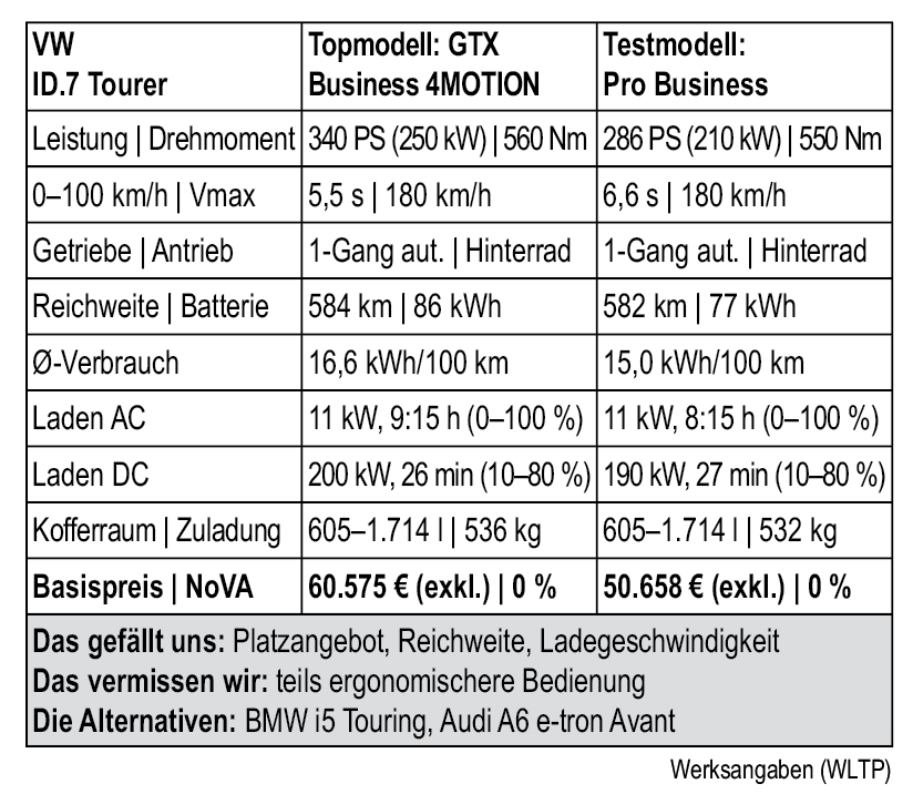 In Sachen Reichweite gibt sich der ID.7 Tourer Pro erfreulicherweise keine Blöße, unsere Normrunde absolvierte er mit einem Durchschnittsverbrauch von lediglich 18 kWh, im Alltag kommt man mit rund 18 kWh über die Runden, was einer Reichweite von circa 420 Kilometern entspricht. Beim Laden sind AC elf kW Standard, in 8:15 Stunden ist der Akku an einer herkömmlichen Wallbox somit wieder gefüllt. Am Schnelllader nimmt der VW bis zu 190 kW auf, zehn auf 80 Prozent sind damit in 27 Minuten erledigt. Schnäppchen ist der ID.7 Tourer wie eingangs erwähnt keines, in Anbetracht des Gebotenen ist der Einstiegspreis von 50.658 Euro netto aber in Ordnung. Erfreulich: fünf Jahre Garantie bis 100.000 Kilometer auf das Fahrzeug, acht Jahre beziehungsweise 160.000 Kilometer auf den Akku.