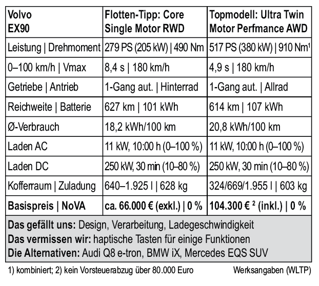 Dank einer netto 107 kWh großen Batterie gibt Volvo einen WLTP-Verbrauch von 614 Kilometern an, Praxiswerte liefern wir beim längeren Test nach. Nachgeladen wird an Schnellladern mit äußerst flotten 250 kW, in nur 30 Minuten wird der Akku im Idealfall von 10 auf 80 Prozent geladen. Die Preisliste startet aktuell beim Twin Motor AWD Plus bei 93.460 Euro (kein Vorsteuerabzug), der heckgetriebene Einsteiger soll in Basisausführung unter 80.000 Euro (ca. 66.000 Euro netto) nachgeliefert werden. •