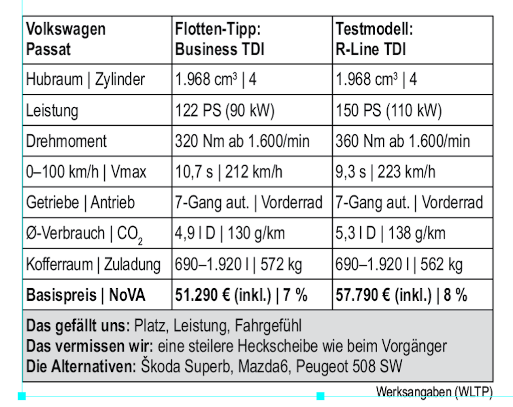 Wie gut, dass das auch auf die Ergonomie zutrifft. Hier hat VW definitiv aus den Fehlern der letzten Jahre gelernt, was sich vor allem an zwei Dingen festmachen lässt: Zum einen, dass das Lenkrad endlich wieder über echte Knöpfe anstelle der mühsamen Touchfelder verfügt, was die Bedienung mehr als nur vereinfacht. Und zweitens, dass das Infotainmentsystem fehlerfrei arbeitet und absolut logisch aufgebaut ist. Alles wirkt intuitiv angeordnet und Ablagen gibt es ebenso sonder Zahl, die volle Punktezahl in diesem Kapitel ist dem Passat also sicher. Knappe Kalkulationen Natürlich hat das alles seinen Preis. Während die 150-PS-Diesel bei 52.990 Euro anfangen, liegt der von uns getestete R-Line schon bei schlanken 57.790 Euro. Natürlich bekommt man hier eine Menge Auto mit einem wahren Bündel an Talenten, viel Platz, Komfort, Sportlichkeit, Sparsamkeit, aber dennoch. Wir reden hier nach wie vor von einem Passat. Einem Volkswagen, zumal die Fahnenstange noch nicht erreicht ist. Wer auch noch 19-Zöller und das Glasdach will, kann zum Sport für 58.390 Euro greifen, wobei man richtigerweise dazusagen muss, dass der „Business“ in Summe seiner Eigenschaften schon ziemlich optimal auf den Flottenkunden zugeschnitten ist. Hier gibt es für „nur“ 52.990 Euro bereits Radar-Tempomat, Rückfahrkamera und viele Komfort-Goodies ab Werk.