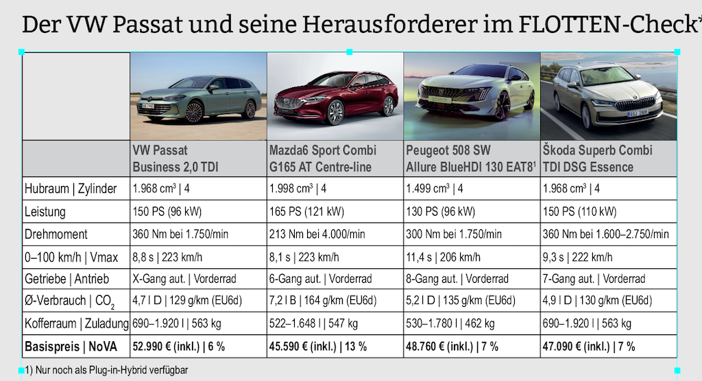 Der ebenfalls 150 PS starke eTSI kostet zwar 4.000 Euro weniger, liegt beim Verbrauch aber schon am Papier um gut 0,5 Liter höher. Und die Plug-in-Hybride mit mindestens 204 Pferden fahren zwar gut 100 Kilometer rein elektrisch, starten aber erst bei 54.790 Euro beziehungsweise 64.790 Euro für die 272-PS-Variante, sind also trotz des Normverbrauchs von rund 0,5 Litern nur bei gutmütigen Buchhaltern eine Alternative. Sehr wohl aber der kleinere, nur 122 PS starke Diesel, den es lediglich als Business gibt. Damit startet der Passat zumindest bei 51.290 Euro, womit er auch den Superb Combi zumindest ausstattungsbereinigt unterbietet, den gibt es mit diesem Antrieb nämlich überhaupt nicht.