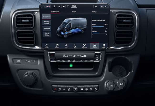 Je nach Präferenz lässt sich aus drei Fahrmodi wählen, um die Leistung und Reichweite des Movano Electric optimal zu nutzen: „Normal“ (auf 160 kW Leistung begrenzt), „Eco“ zur Reichweitenoptimierung (120 kW) und „Power“ für maximale Leistung (200 kW). Über Schaltwippen am Lenkrad können Fahrer zudem vier Rekuperationsstufen beim Bremsen einstellen.