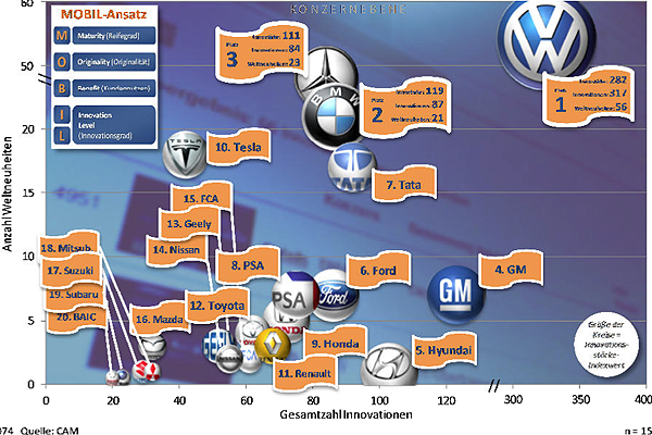 Das Ranking der innovationsstärksten Automobilkonzerne führt im Jahr 2015 der Volkswagen Konzern mit einem Indexwert von 282 Punkten und einem Rekordwert von 317 Innovationen klar an, zu dem vor allem die Marken Audi und Volkswagen beitragen. BMW verbessert sich mit 119 Punkten auf Rang 2 (Vorjahr 4), Daimler rutscht einen Platz nach unten auf Rang 3 (111 Punkte).