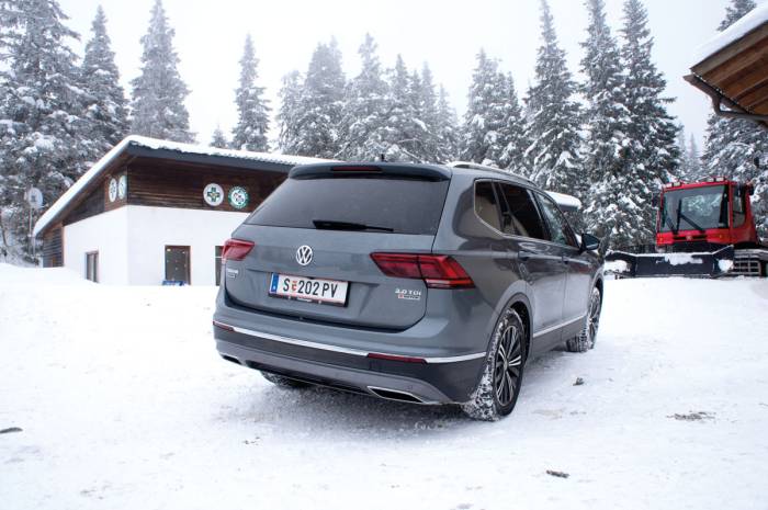 Ob das denn ein Touareg sei, wurden wir an der Tankstelle gefragt. Nun, so groß und wuchtig ist der Tiguan Allspace zwar nicht, so viel (je rund zehn Zentimeter in Länge und Breite) fehlt aber auch wieder nicht zum SUV-Flaggschiff. Zurück zum Tiguan Allspace. Man sieht der Langversion den Unterschied zur Standardvariante nicht nur an, man spürt ihn auch. Zum Beispiel am Sitzabstand im Fond, der fast verschwenderisch groß ausfällt. Auch der Kofferraum schluckt 145 Liter mehr und bringt es auf 760 Liter. Auf Wunsch gibt es eine dritte Sitzreihe, wodurch der Allspace zum Siebensitzer mutiert. Skifahrer schätzen jedenfalls die Durchlademöglichkeit, auf eine Dachboxkann man bei diesem Raumangebot jedenfalls getrost verzichten, auch bei vier Personen an Bord.