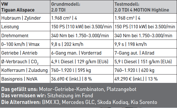 Bei der Ausstattung unseres Testwagens war VW dann weniger sparsam und hat kaum ein Extra ausgelassen. Erwähnte Optionen plus Leder oder Sky-Paket schlagen dann mit einem Testwagenpreis von knapp 59.000 Euro zu Buche, das antriebsseitige Grundmodell ist ab 49.580 Euro zu haben, der Einstieg zum Tiguan Allspace beginnt bei 36.690. Der Aufpreis für den Allspace liegt je nach Ausstattung bei 3.000 bis 4.000 Euro.