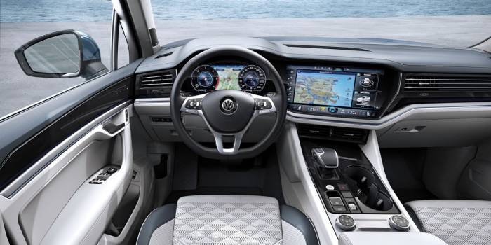 Die Chefetage ist oben. Entsprechend ist nun der Touareg, der wortwörtlich eine Etage höher als der Arteon liegt, das neue Topmodell im Hause Volkswagen. Neben einem bulligen Auftritt gibt es zahlreiche neue Optionen, die diesen Anspruch rechtfertigen. Wer in die Vollen greift, kann das 4.878 Zentimeter lange SUV (plus 77 Millimeter zum Vorgänger) durchaus in sechsstellige Euro-Regionen bringen. Am auffälligsten ist der Innenraum eines bestens konfigurierten Touareg, die Bildschirmlandschaft gab es in dieser Art noch nie bei VW. Zum zwölf Zoll großen Screen für die digitalen Instrumente kommt ein 15 Zoll großer Touchscreen, der ebenso individuell konfiguriert werden kann. Das funktioniert sogar recht intuitiv, wie wir auf ersten Testfahrten rund um den Wilden Kaiser in Tirol feststellen konnten.