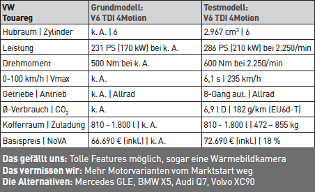 Motorisch setzt VW den Diesel in den Fokus, zum Start gibt es nur den 286-PS-TDI, Ende Juni folgt bereits das 231-PS- Pendant. Im Frühjahr 2019 wird mit 421 PS die V8-TDI-Stufe gezündet. Die Prognose des Importeurs: Nur drei Prozent der Kunden werden sich für den V6 TSI (340 PS) entscheiden, der im August 2018 dazustößt. Ein Hybrid ist vorerst nur für China geplant. Ja, er soll anders konfiguriert auch nach Europa kommen.Details? Ungewiss. Sicher ist: Ein Untersetzungsgetriebe bekommt der Allradler nicht mehr, das Ziehen von 3,5-Tonnen-Lasten ist möglich und ein hervorragender Trailer- Assistent unterstützt auch Unbeholfene beim Rangieren.